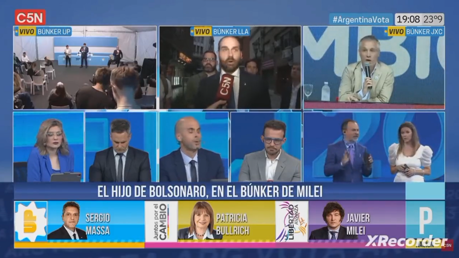 Mientras C5N realizaba su operativo por las Elecciones Generales 2023, en las que sorpresivamente Sergio Massa lideró las preferencias por la Casa Rosada y disputará el balotaje contra el ultraderechista Javier Milei, se entrevistó en el bunker del libertario a Eduardo Bolsonaro, uno de los hijos de Jair.